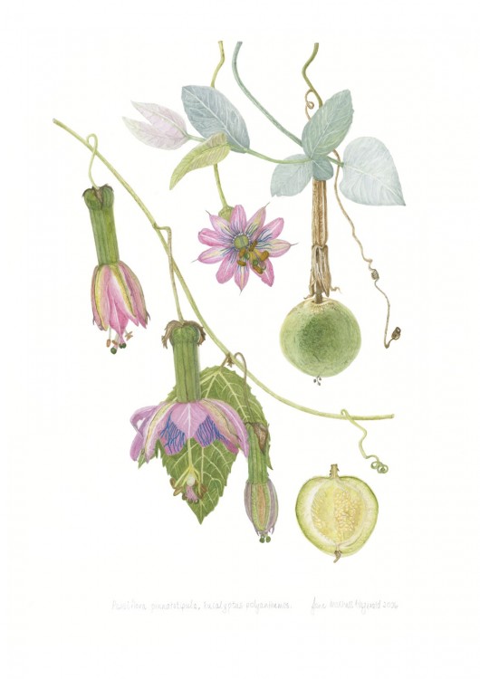 Similarly, a rare passionfruit plant in one of my paintings has a trick to encourage a preferred pollinator by changing the angle of the pollen bearing parts allowing it easier access to pollen and the sweet nectar while deterring other insect visitors. The skirt of blue filaments in the flower is thought to represent the crown of thorns placed on Jesus’ head.