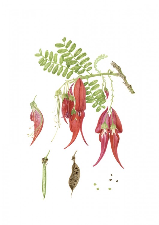 The painting of the Lapageria shows a small pod or fruit containing seeds that I found fallen on the ground under the vine. This was unusual given the absence of the hummingbird in NZ and confirmed by the garden curator who said seed pods were rarely seen. I wanted to paint this plant despite it being a very high climbing vine in the Botanical Gardens.