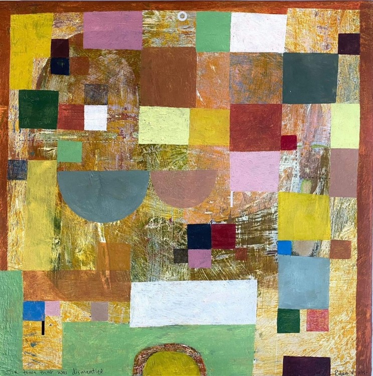 The images in this exhibition grew out of the large water colours that I previously exhibited at the Moray Gallery in 2019 with the title “Broad Bay Boogie Woogie”.  Using the square as a starting point and basis for the work, all of the works are loosely (some more than others) based on the concept of an imaginary city.