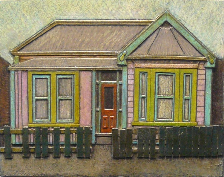 I came to New Zealand, to Oamaru almost 20 years ago. My interest in the preservation of old buildings, architecture and good design remains and what I am doing here is a combination of this and the continued desire to make artwork. I'm particularly interested in older, often neglected buildings, some with inevitable changes made over time, and have developed a patina of age with flaking layers of paint, faded and worn surfaces, rust, lichens and so on. I seem to simplify the buildings somewhat and then work away in paint and pastel to try to create a patina reminiscent of what I saw.